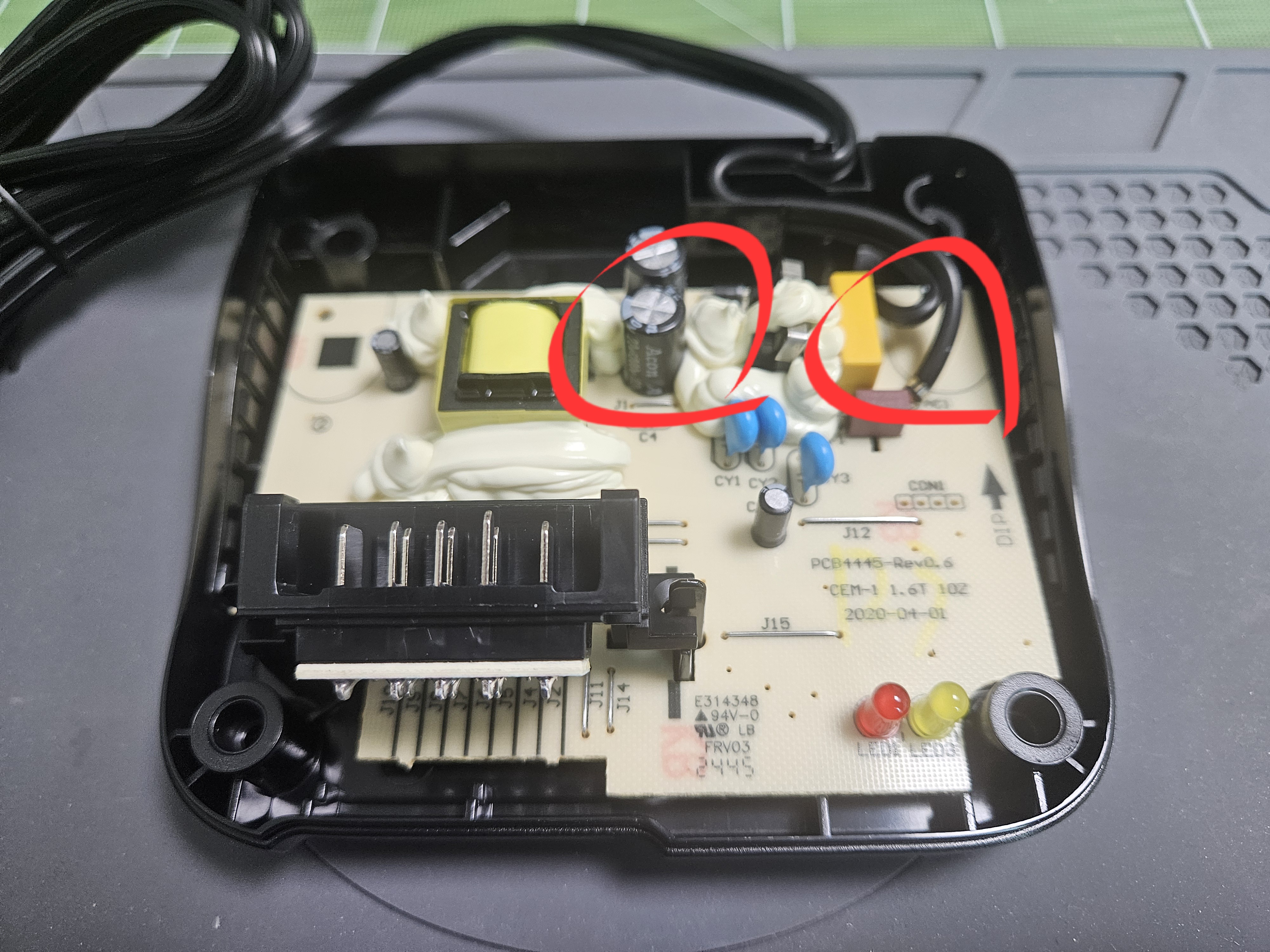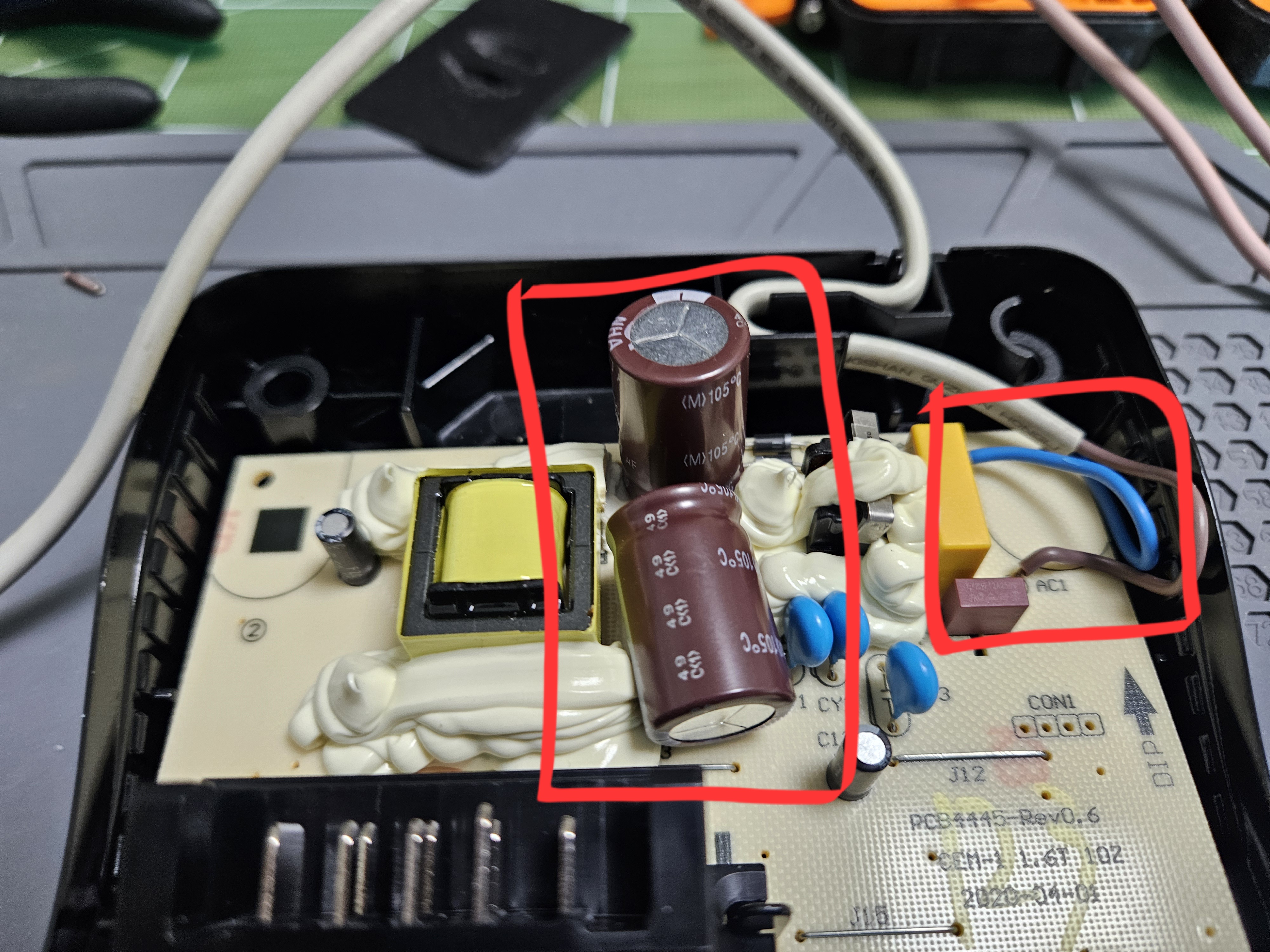 사진에 동그라미친 콘덴서 2개와 AC코드의 납을 녹여서 제거할 겁니다.